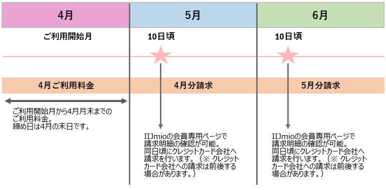 例えば、4/1~4/30分までを4月のご利用料金として、5/10前後にクレジットカード会社へ請求いたします。