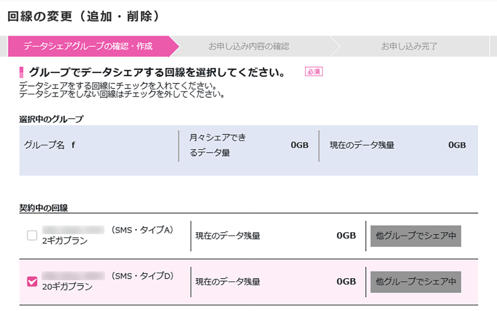 ※既にシェアをしている回線はチェックが入った状態で表示されます。別グループに登録されている回線を追加で選択してください。