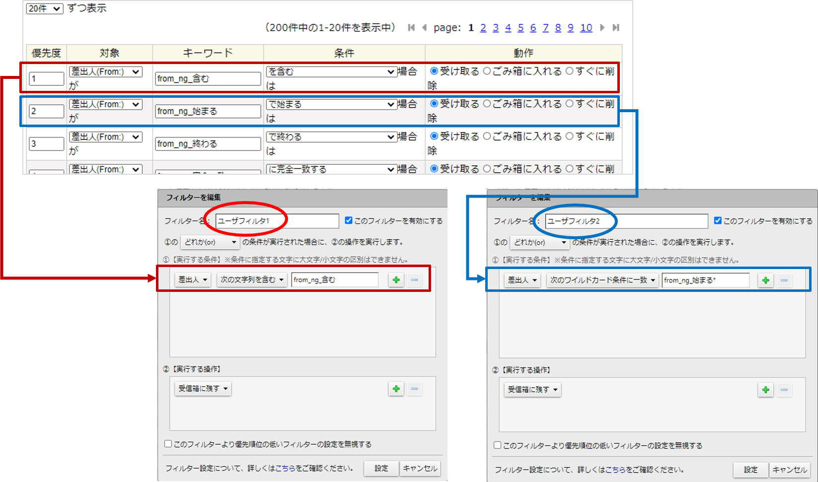 ※ 1. ~ 6. の番号は、「メールフィルタ」の番号に対応しています。