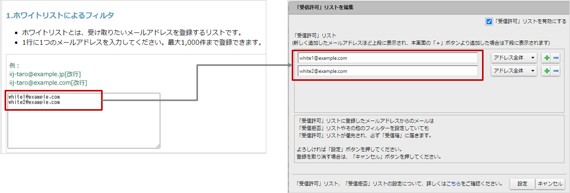 ・メールフィルタ設定 「5. 条件指定によるフィルタ 」のうち、”対象”を「全ヘッダ」としたフィルタ