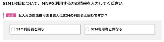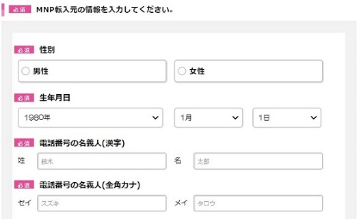 選択後、MNP転入元の情報入力欄が表示されますのでMNP転入元の 情報を入力し、お手続きを完了させてください。