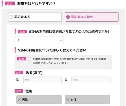 端末選択、オプション選択が終了いたしますと、以下が表示されますのでSIM利用者と異なるをお選びください。
