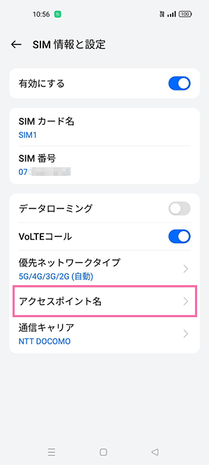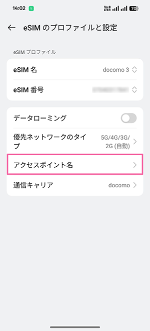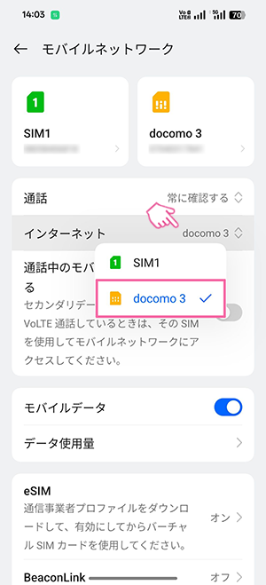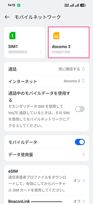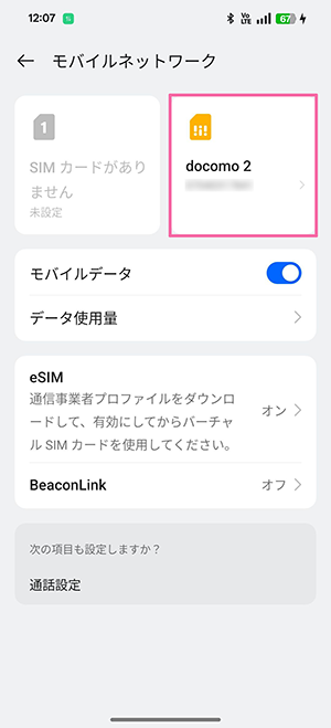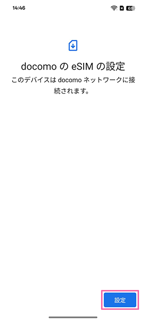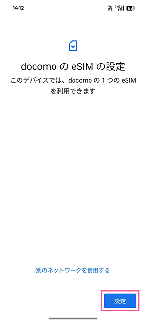 ※以下の画像では音声eSIM(タイプD)のため「docomo」を選択しています。