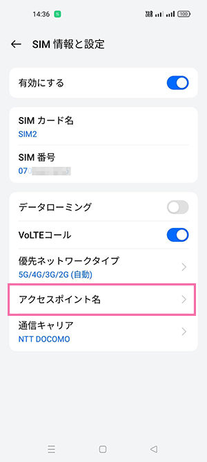 ⑭追加したAPNを選択した上で、上部の「←(戻るボタン)」を選択する