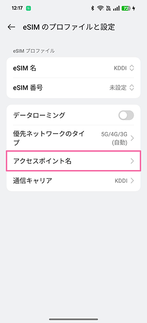 音声eSIM(タイプA)の場合は「KDDI」、データeSIMの場合は「IIJ」と表示されます。