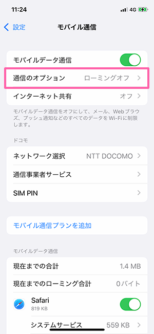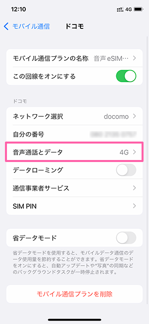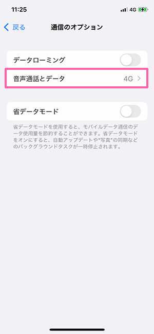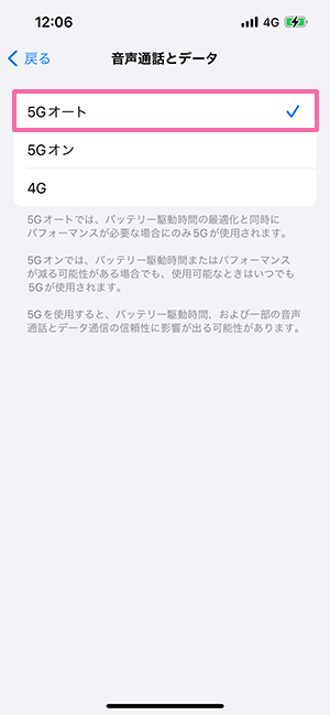 該当のSIMの5GオプションがON(5Gと表示されている)になっている場合は、OFFにします(4Gに切り替えます)。